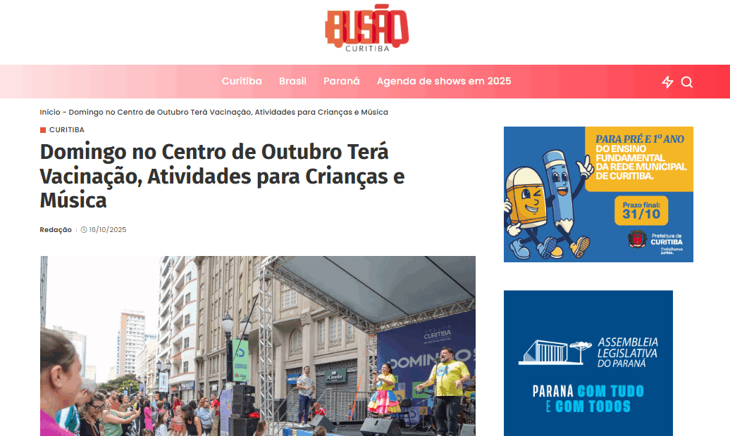 Neste final de semana, a Prefeitura de Curitiba promove mais uma edição do evento “Domingo no Centro”, no dia 19 de outubro. A atividade, que ocorre na Rua XV de Novembro, entre a Praça Osório e o Bondinho da Leitura, contará com diversas atrações, incluindo atividades infantis, orientações sobre saúde, exposições e um palco com apresentações da Rádio Mix. O evento é gratuito e funcionará das 9h às 15h.