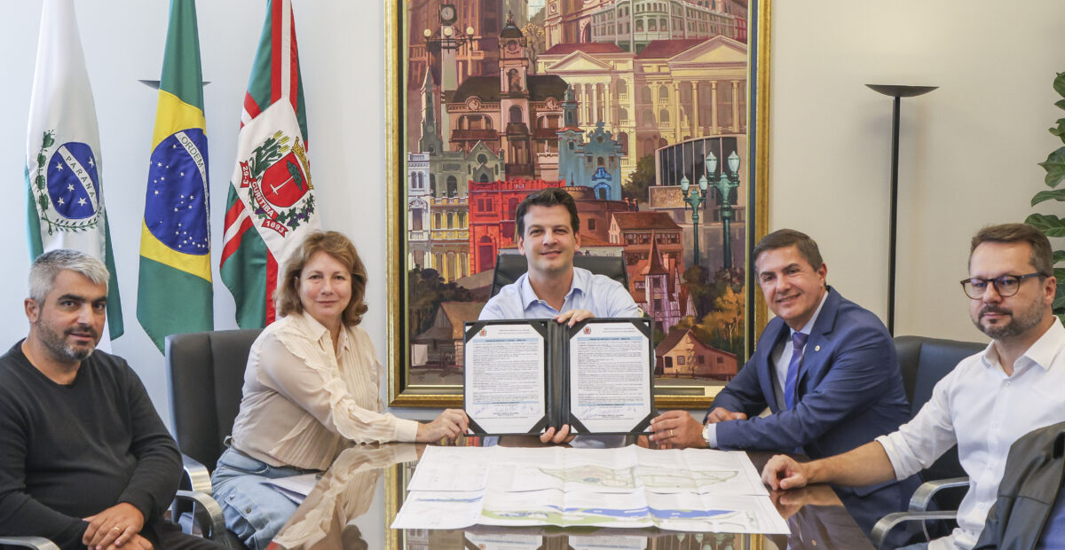 Prefeito Eduardo Pimentel com a secretária do Meio Ambiente, Marilza Dias, o secretário do Governo Municipal, Marcelo Fachinello, e o vereador Jasson Goulart, assina autorização para a revitalização do Parque Náutico e da Praça Menonitas. Curitiba, 01/04/2026. Foto: Pedro Ribas/SECOM