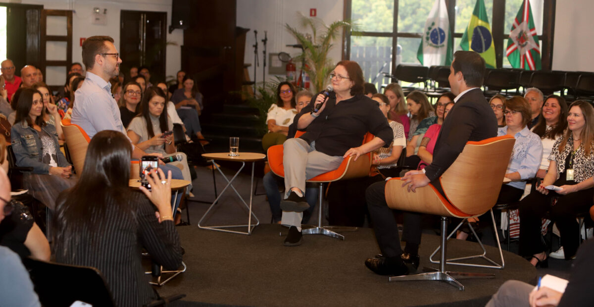 A manhã começou com um bate-papo com a presidente do Imap e o secretário do Governo Municipal, Marcelo Fachinello, que foram entrevistados pelo secretário da Comunicação, Marc Sousa. Beatriz e Fachinello puderam compartilhar seu histórico profissional, desafios de gestão, assim como aspectos da vida pessoal.
