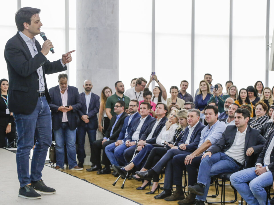 O presidente da Câmara Municipal de Curitiba, Marcelo Fachinello, e os vereadores Osias Moraes e Maria Leticia – que compõem a mesa executiva da Casa – receberam, nesta quinta-feira (09), o Plano Municipal de Políticas para Mulheres de Curitiba.